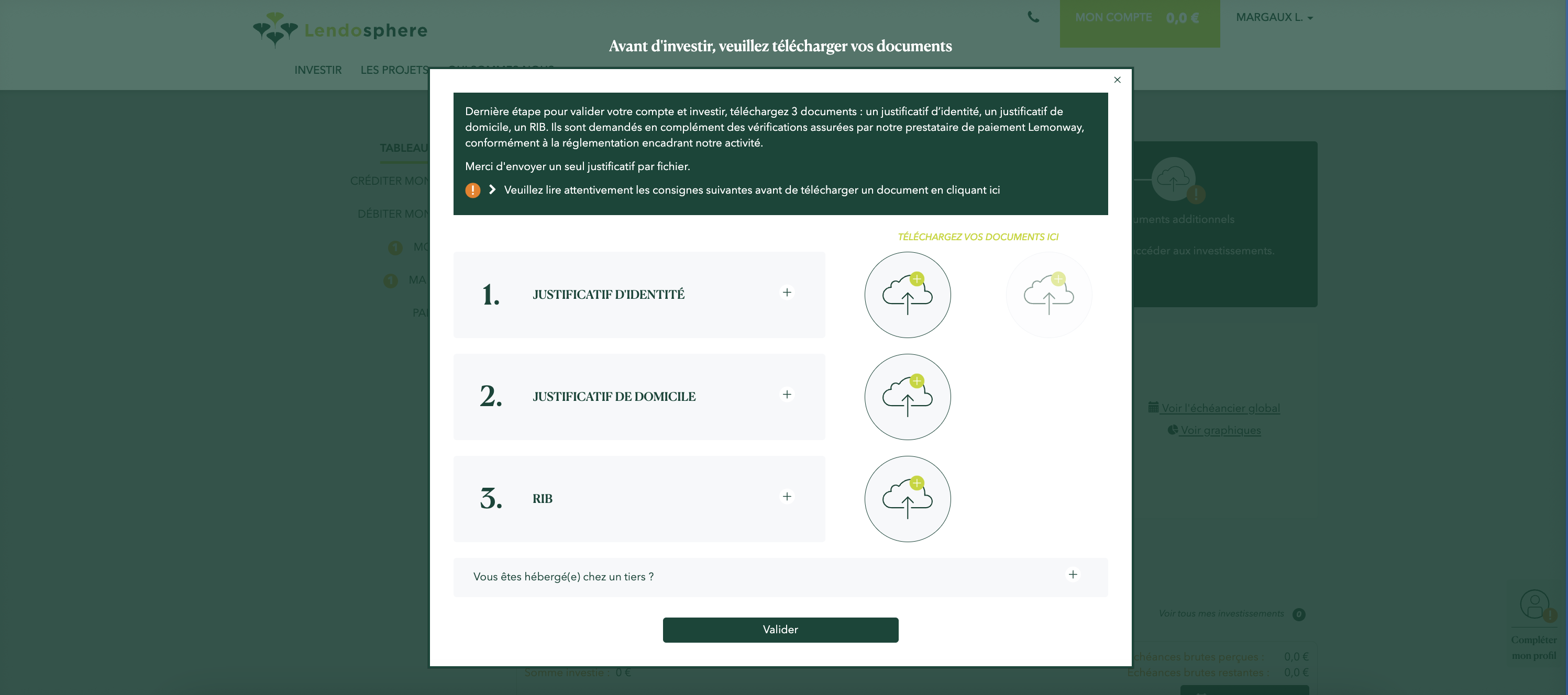 Conformément à la réglementation des plateformes de financement participatif, les flux financiers liés aux investissements sur Lendosphere sont gérés par un prestataire de service de paiement agréé. Depuis 2014, notre partenaire est la société Lemonway. La validation de votre compte passe par une interface de Lemonway pour la vérification de votre identité. Pour cela, vous devrez vous munir de votre carte d'identité. Lemonway vous demandera également une vérification d’identité par reconnaissance faciale, à l'aide de votre téléphone portable.