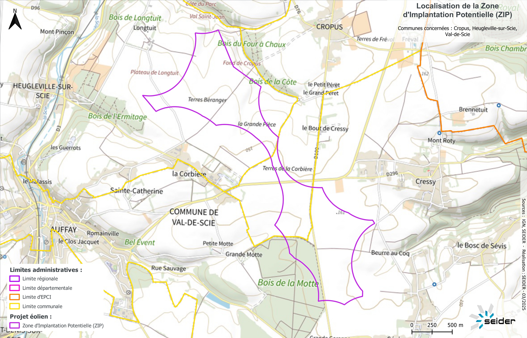 Depuis plusieurs années, l’équipe SEIDER explore la possibilité de développer un projet éolien sur les communes d’Heugleville-sur-Scie, Cropus et Val-de-Scie. Entre fin 2020 et 2021, une première phase d’études cartographiques et de prises de contacts sur le terrain a confirmé le fort potentiel de la zone identifiée.
